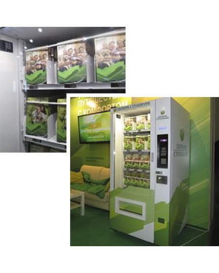 Результат: создана автоматизированная точка продаж с минимальными издержками, необычный формат рекламы и информации о компании на автомате привлекает внимание издалека.